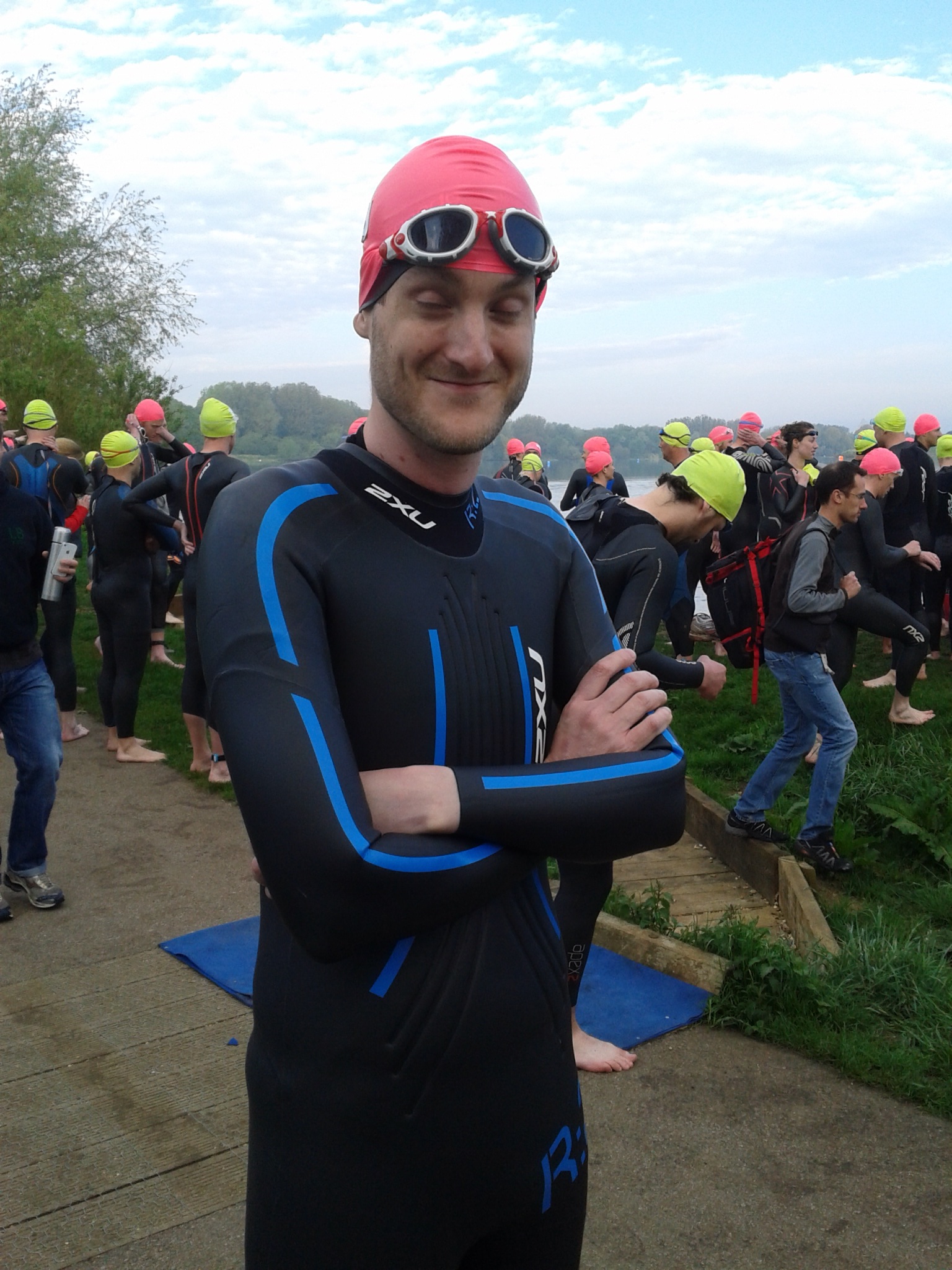 I’d set myself a target time of 90 minutes, based largely on an expectation of a certain level of panic, and just generally wanting to taking it slow and stay relaxed ahead of the long day ahead. According to this I should have started towards the middle of the pack in Bay 3 but I also wanted to avoid the usual mass swim start kicking and punching which could result in a loss of goggles/swim hat and a generally bad start to the day. The organisers suggested that the back of Bay 1 on the far left was an option, since this group of elite swimmers would sprint off quickly leaving lots of room for slower starters to join them. My concern was that since the swim was clockwise round the lake, even starting slower in Bay 1, you’d have lots of swimmers from Bays 2-4 converging across the lake and swimming across you.  Adrian, on the other hand suggested the front of Bay 4 would be a good place to start – here I would be assured of being faster than everyone else (assuming I didn’t panic too much) and could swim across the lake to join the main pack, but at a point I was happy with, in a group of swimmers swimming at my speed. This is what I decided to do.