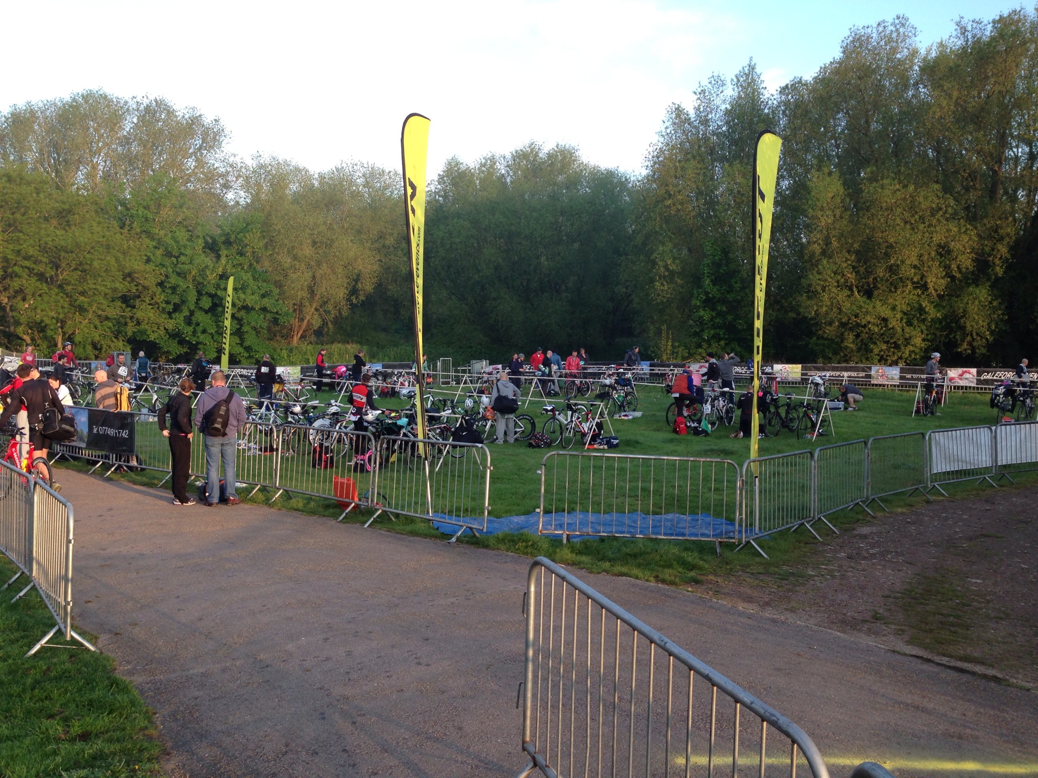 TransitionThe event was due to start at 7am. I set my alarm for 4, got out of bed and immediately force fed myself a high carb breakfast (big bowl of cereal, two bananas, High 5 Energy Bar & 500ml Energy Source). To be honest, that was difficult enough – me and breakfast don’t see eye to eye on most days, but a big breakfast like that at 4am was hard to stomach. I just about kept it down. I got to Priory Marina at about 5:30 and set up in transition – put my nutrition on my bike, laid out my bike and run gear to change into in T1/T2 and squeezed myself into my wetsuit for the race briefing at 6:45. So far, so good.