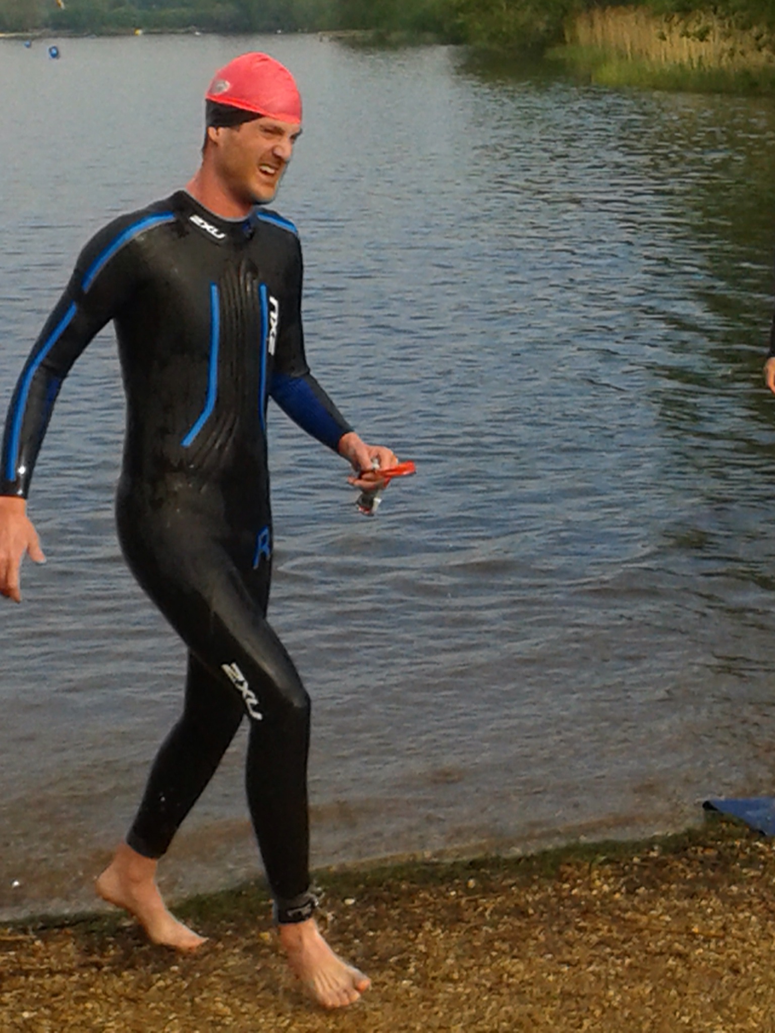 2013-07-12 12.09.15The next 1800m or so was more of the same, quite uneventful, but I was surprised at how easy I was finding it. I was arguing with myself about whether or not to go harder and faster, but sensibly I maintained pace and headed back to the boathouse and the end of the swim. About 100 metres from the end, all the swimmers were funnelled towards the finish bay, and I ended up swimming quite close to the edge of the lake. It was quite weedy at this point and there was a distinct smell of duck poo which wasn’t so nice! Still, I could see the end now! I could see people being pulled from the lake by volunteers and I could see the clock said 1:20 something, which was a surprise considering how easy I thought I was taking things.