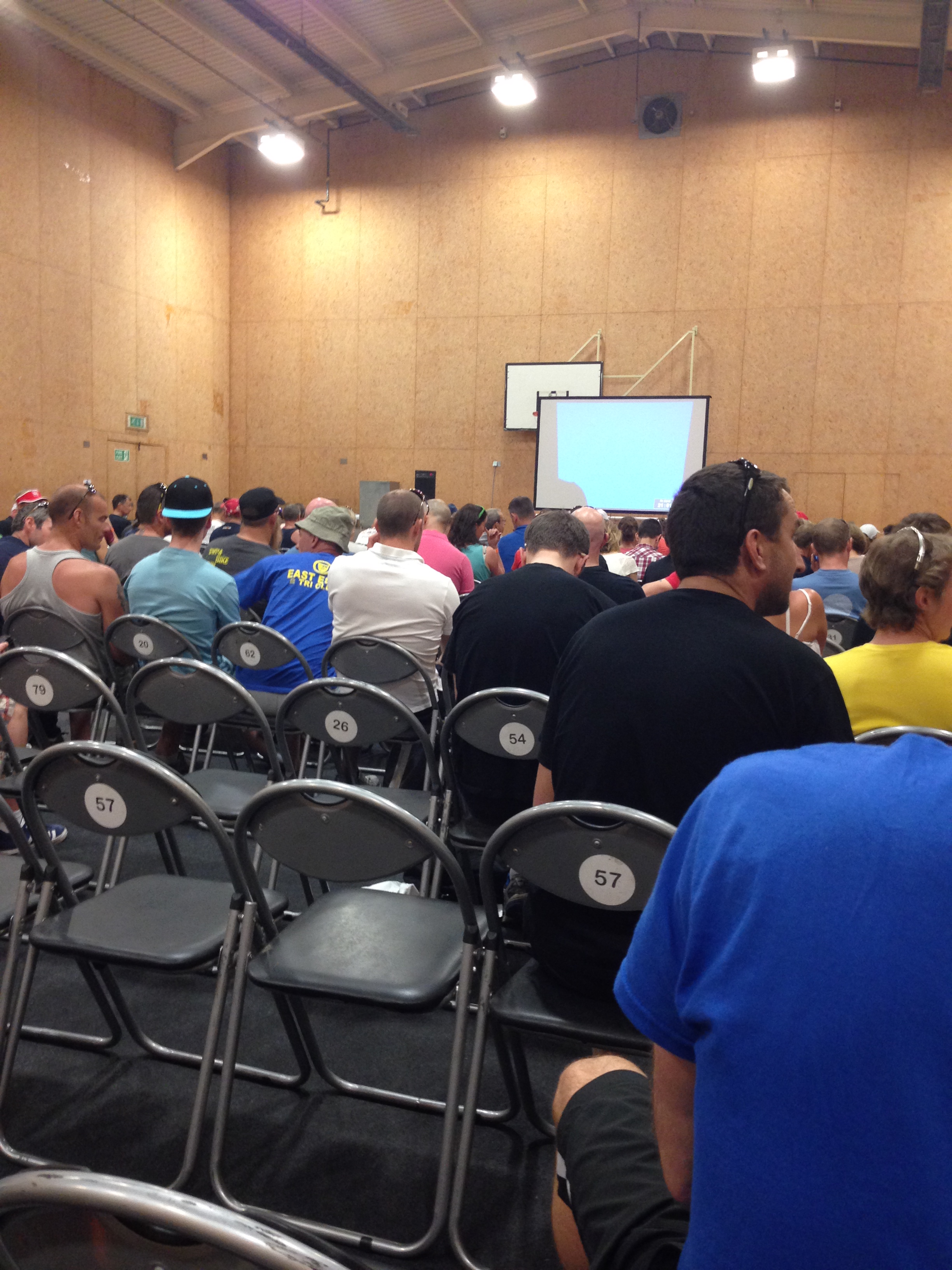 I left home just after 8 on Saturday (alone – Claire, the kids and the Mother-in-law were leaving later in the afternoon) with a view to getting to the National Watersports Centre (NWSC / Holme Pierrepont) in time for the first race briefing at 11. Luckily motorway traffic was on my side and a quick 2.5hr sprint up the M40/M1 got me to the NWSC in time to run into the briefing at 10:59. Even at that time of the morning, the temperature outside was in the high 20’s and inside the sports hall where the briefing was being held it was even higher.  The briefing was long and didn’t give us too much more information than was in the information pack – certainly no last minute changes to be worried about – but it did give me the opportunity to look around at my fellow competitors who all looked significantly fitter than me.