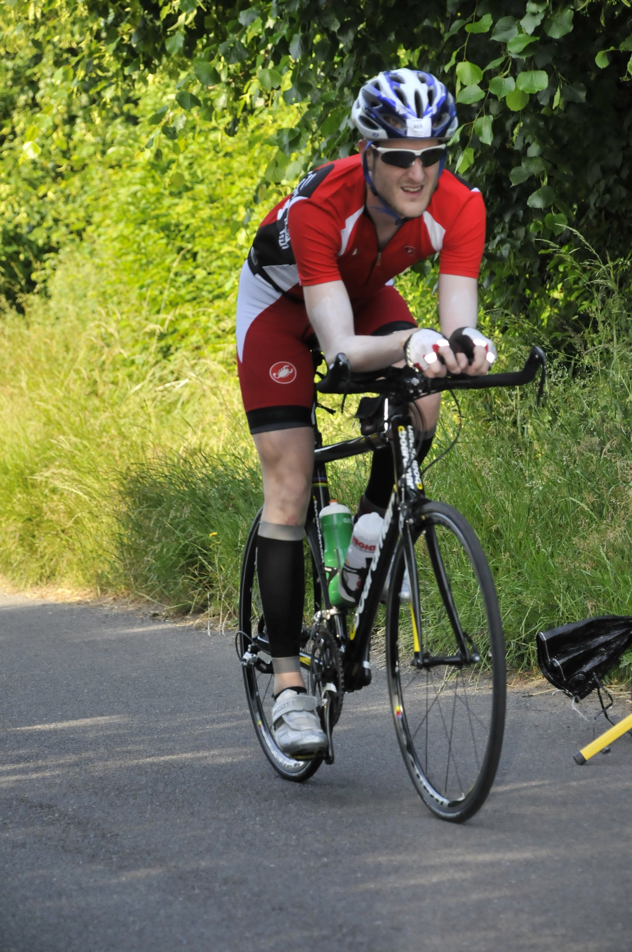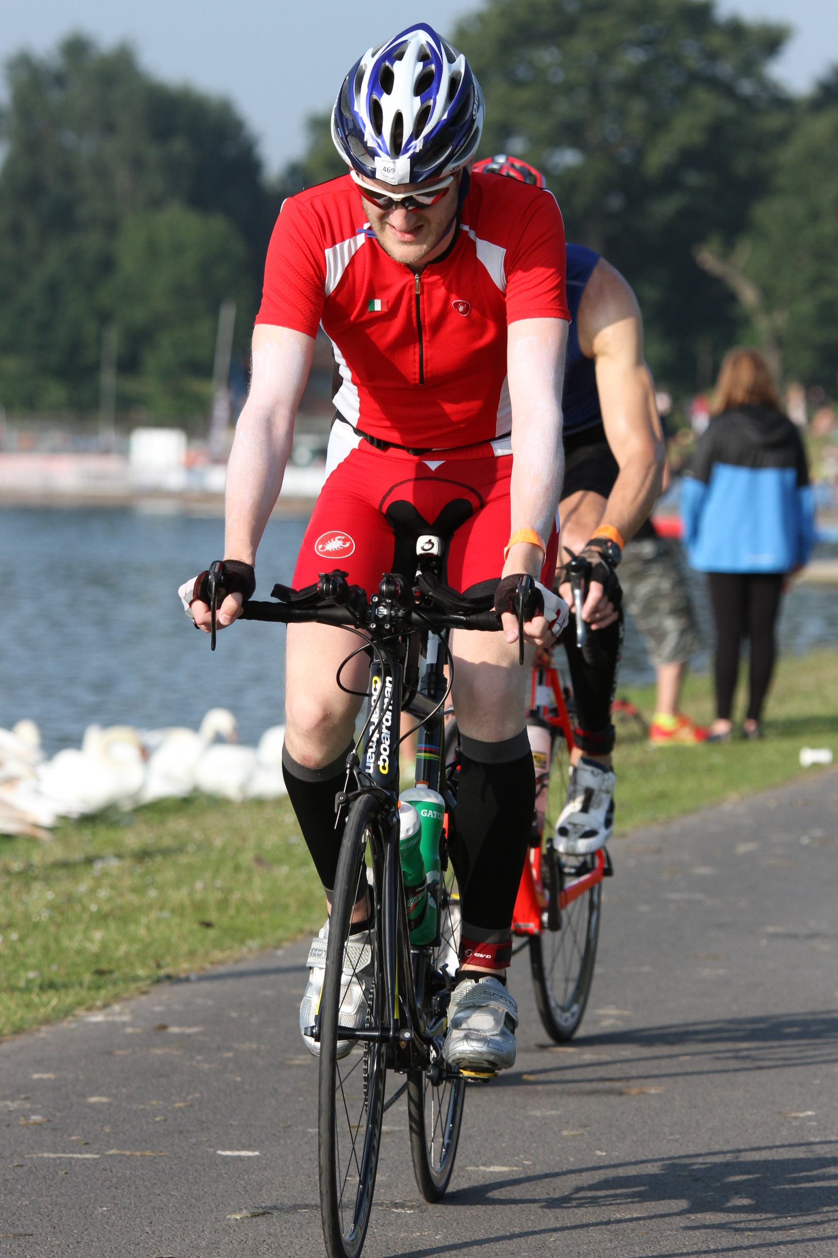 Back in transition and I quickly removed my wetsuit, threw on some bib shorts, dried my feet and put on some socks and my cycling shoes. The weather was a bit overcast (at this point) so I also put on a long sleeved cycling top. This is where it got comical, I went to put on my new helmet (Giro Selector – never used in an event but worn on a couple of occasions) widened the “aperture” (for want of a better term) to squeeze my massive head into and promptly unclipped one of the side panels. In trying to put it back on, I then managed to pull the clip off one side of the “buckle” which holds the thing on my head. Bad times. I spent at least 4 minutes longer than I needed to sorting this out, including tying a knot in the strap. Nightmare.