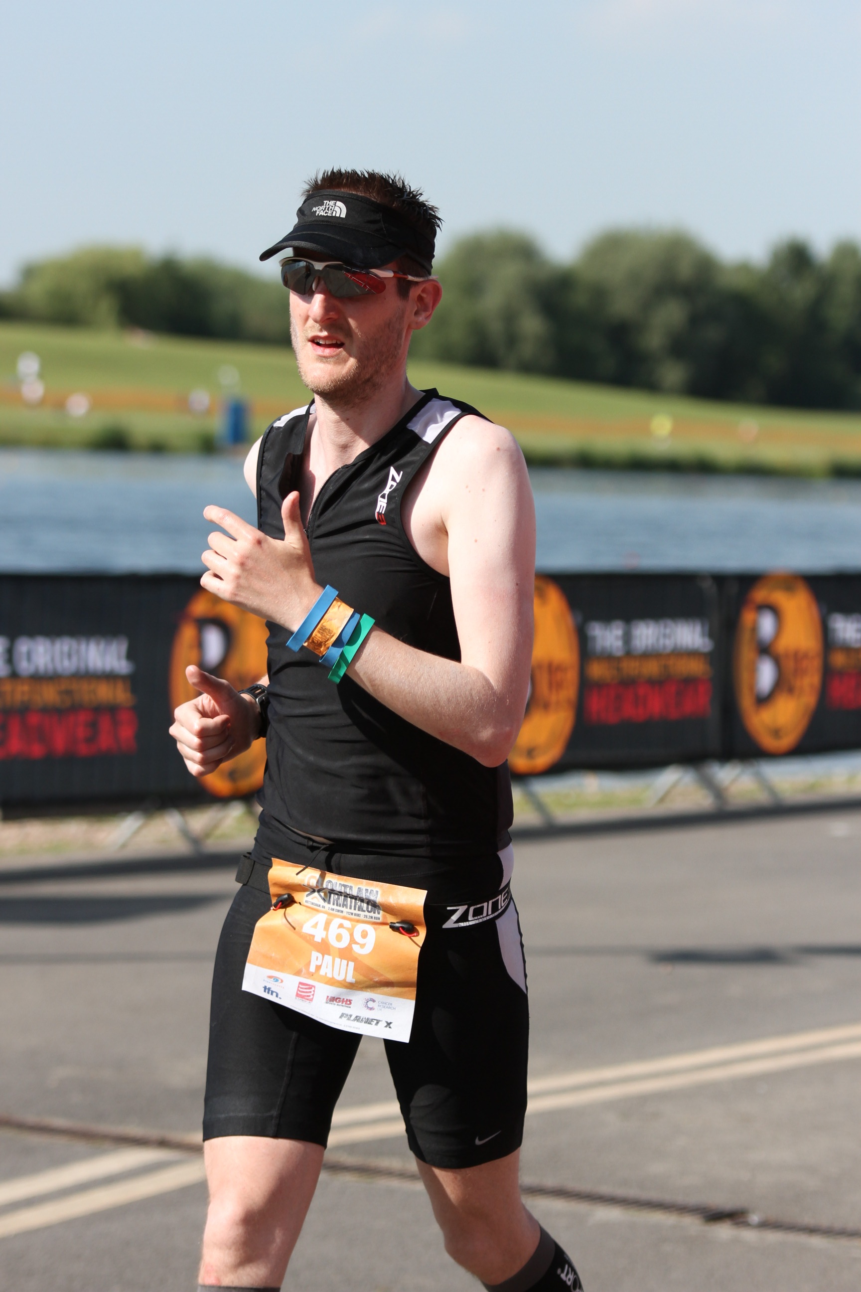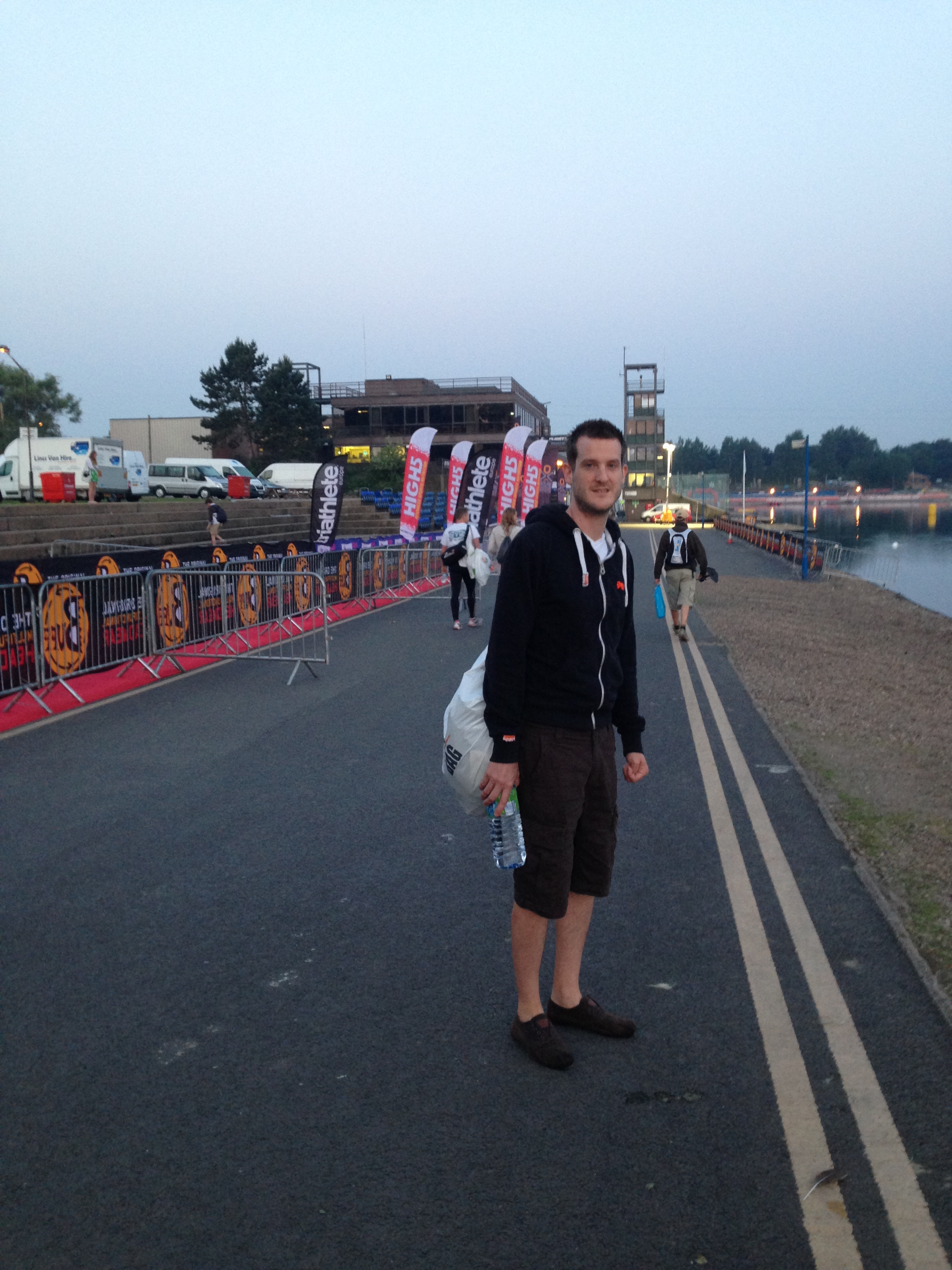 Anyway, the run started relatively well, in that I was actually running. I managed to make it most of the way round the lake, stopping at both of the feed stations only to douse myself in ice cold water and to collect the first of four wristbands I’d need before I could cross the finish line. I felt good for the first couple of miles before my stomach started to slosh around, much like it did back in Bedford. I worried that this would be it for the next 4 hours or so, not being able to consume any nutrition and generally feeling uncomfortable. On my second loop of the lake I took a gel at the first station, collected another wristband, threw water over myself and carried on to the next station. Admittedly, I’d already started to run/walk, the sloshing being uncomfortable, but I was sticking to 10mins run/2mins walk. Through the next station on the NWSC side of the lake, no liquid again.