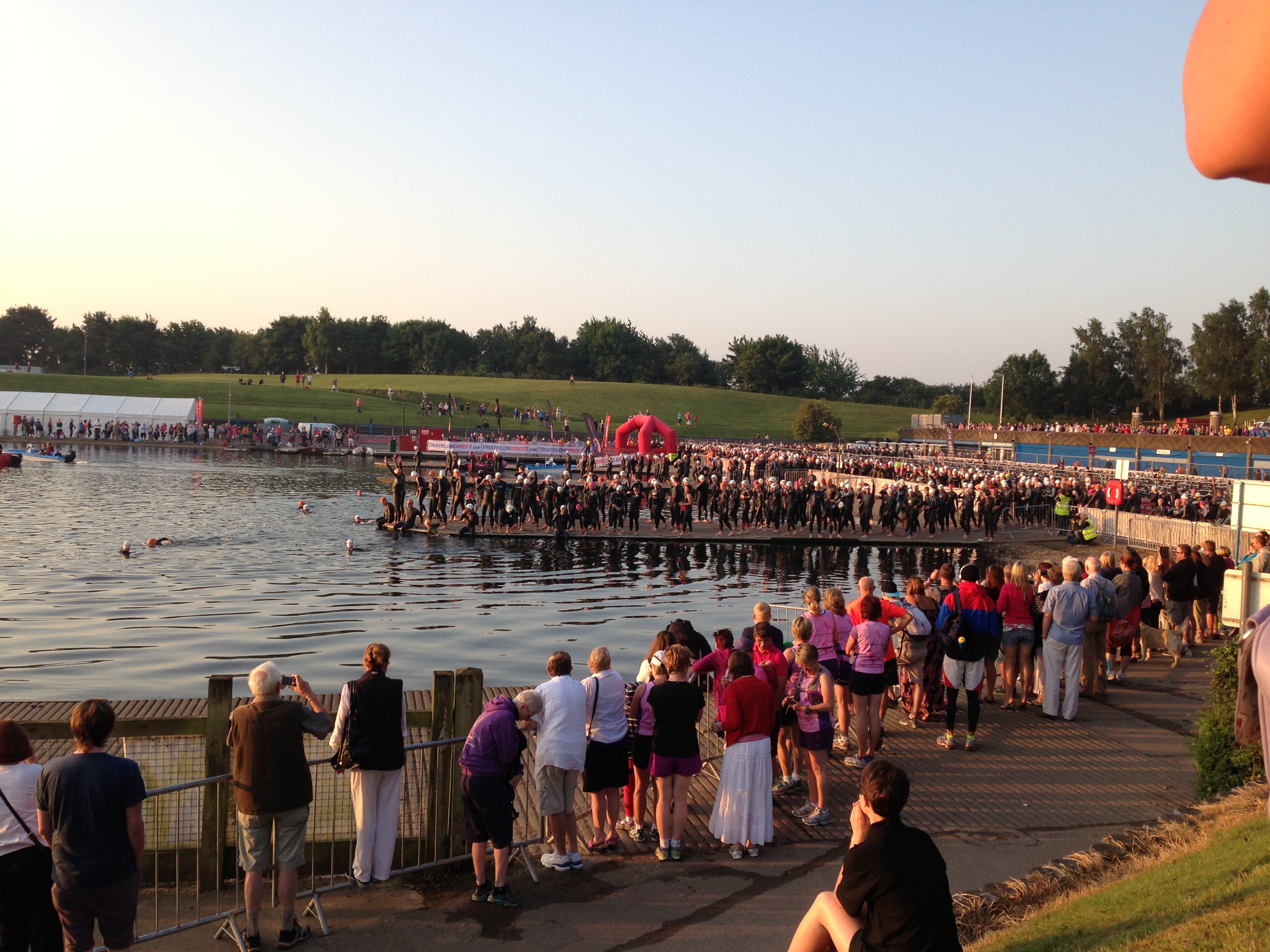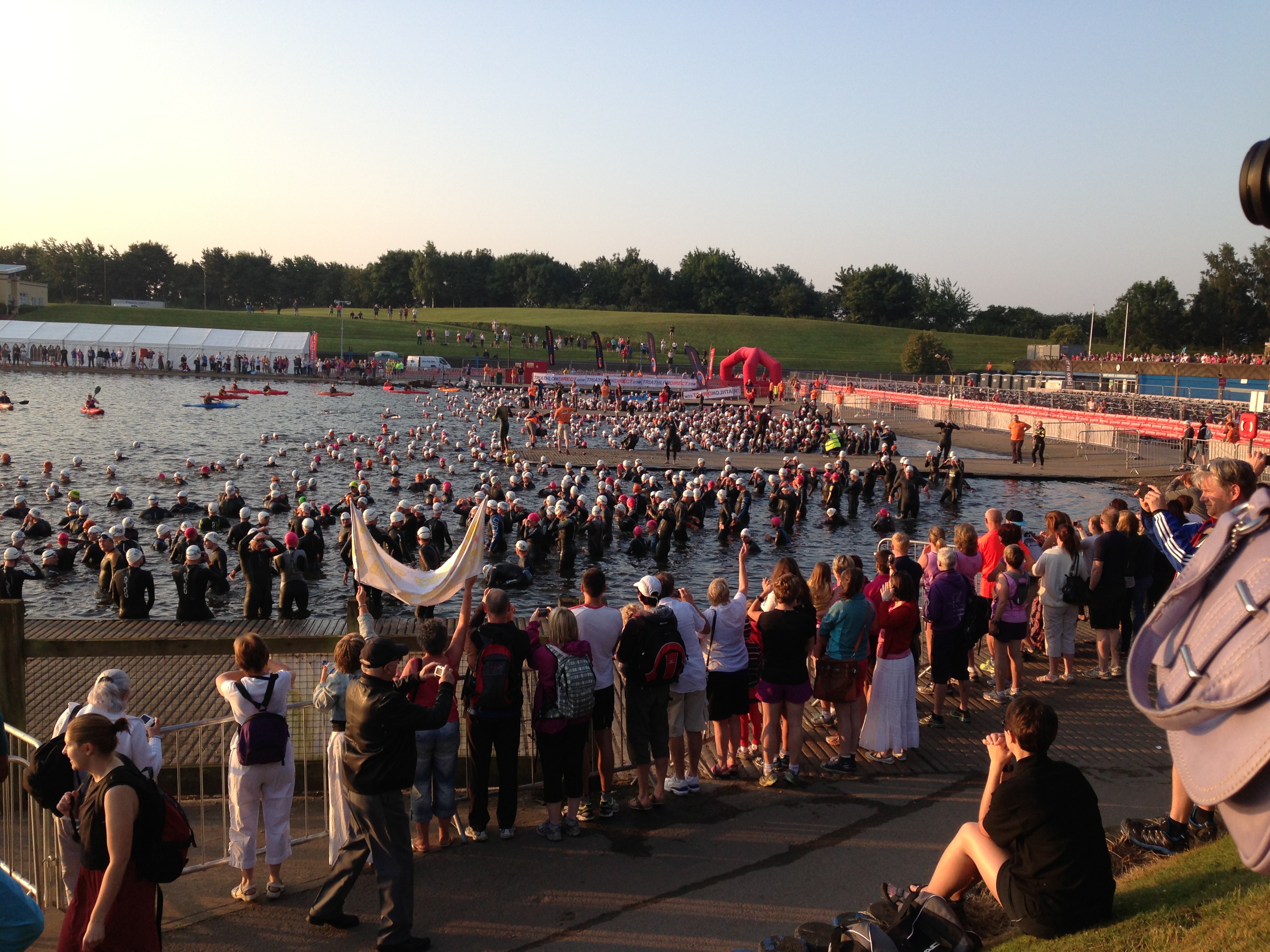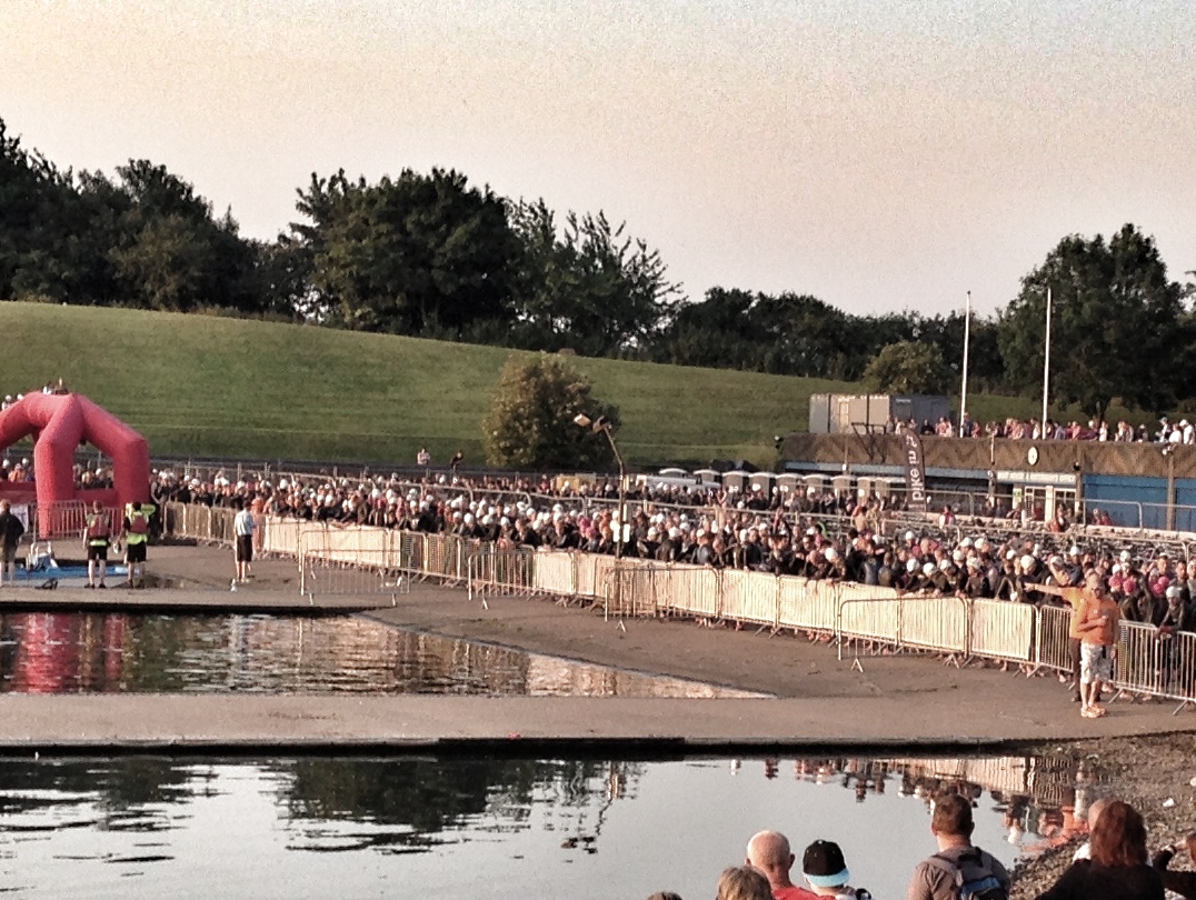 IMG_1137At about 5:45 the barriers preventing swimmers from entering the water were removed and I walked down to the edge of the lake and sat with my feet in the water for a few minutes, put my swim hat on, cleaned my goggles and started to get my head straight. Unfortunately all I could think about was whether or not all my prep was right; had i put all the right kit in the right bags? Did i remember to pump up my tyres to the correct pressure? Was skipping the long queues for the portaloos to “drop off” breakfast a bad idea that would re-visit me later on (*ahem*)….