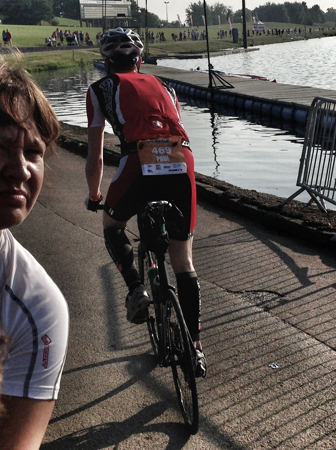 IMG_1141Then the commentator shouts, “Number 941, your bike tyre blew up, we fixed it, you’re good to go”. Someone had overinflated their tyres and the rising temperature had made one of them burst. This wouldn’t be the last of these before the start, and according to Claire there were a few that burst/punctured as soon as they jumped on their bike out of T1. Something else for me to worry about…