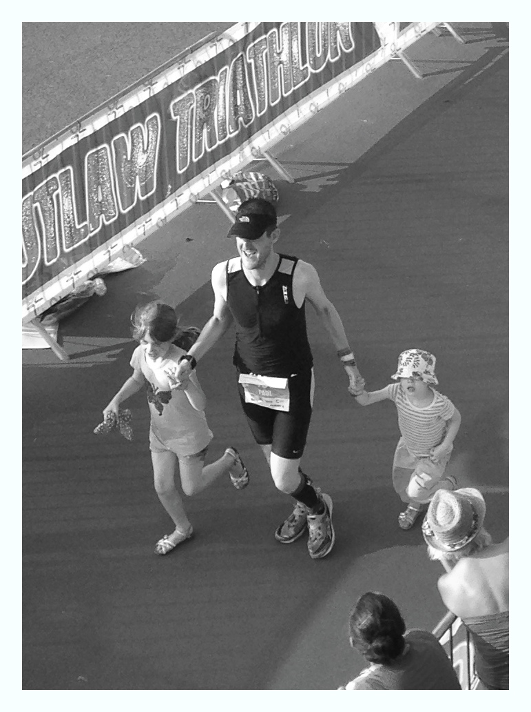 IMG_1274Two last cups of water tipped over my head (a mistake given that 10 minutes later I’d have my finish line photo taken looking like a sweaty mess), one last gel consumed (grim) and I ran for the finish. 500 metres out and I made it to the large crowd of supporters, enjoying their beers and barbecues (bastards!) and cheering wildly at anyone and everyone (heroes!). 400 metres out and I heard a mention of my name on the tannoy which boosted me no end. 300-200 metres and I’m pretty much sprinting – no hint of pain or boredom, fuelled by adrenaline. At 100m I met the mother in law and Lily & Bella who joined me for the last run down the finish chute. Everyone was cheering my name and shouting encouragement to the girls. By this point I was pretty much dragging Bella, and Lily was dragging me, determined to make it to the finish tape before I did. And finally, the words I’d been looking forward to hearing all day – “PAUL JAQUES. YOU. ARE. AN. OUTLAW”.